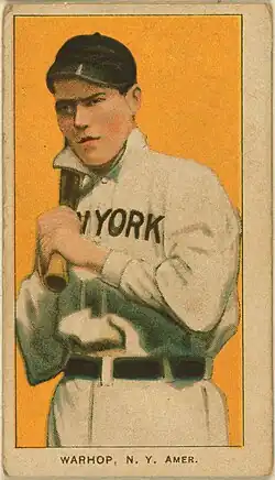 Warhop made his debut on September 9, 1908. He ended up with a 1–2 win–loss record with a 4.46 earned run average (ERA) in five games that year.[3] Warhop became a regular fixture in the starting rotation in 1909. He pitched a three hitter against the Cleveland Nats on August 10, 1909, and finished the year with a 13–15 win–loss record, a 2.40 ERA, and 21 complete games in 36 games pitched as the Highlanders finished fifth in the American League (AL).[3] However, Warhop led the AL in hit batsmen in 1909 (26) and 1910 (18), which might have been caused by his unorthodox pitching style.[3] In 1910, Warhop pitched to a 14–14 win–loss record, a 3.00 ERA and 11 errors (the most among AL pitchers).[3][9]: 22 He was respected throughout baseball, and Baseball Magazine once called him the "unluckiest pitcher in the American League".[1]