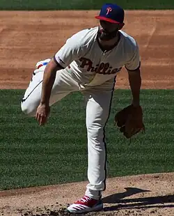 Entering spring training in 2020, Arrieta declared himself "100 percent healthy" and was confident that he would be able to perform during the regular season.[98] The COVID-19 pandemic, which shortened the 2020 MLB season to only 60 regular-season games, proved an added challenge for Arrieta, who was entering the final year of his contract with the Phillies. Rather than having 30 starts to prove himself to the free market crowd as expected, the shortened schedule meant that starters like Arrieta would only expect to see around 10 games of action.[99] He opened the season as the Phillies' No. 3 starter, behind Nola and recent acquisition Zack Wheeler.[100] Two positive COVID-19 tests in the Phillies clubhouse shut the team down for one week, and Arrieta did not receive his first start of the season until August 3, his first MLB appearance in nearly one year. He allowed three runs in five innings of a 6–3 loss to the New York Yankees.[101] Arrieta remained healthy until September 15, when he was shut down for the season with a hamstring injury. In nine starts for the Phillies, he posted a 4–4 record and a 5.08 ERA. Philadelphia chose not to extend his contract at the end of the season, leaving him a free agent.[102]