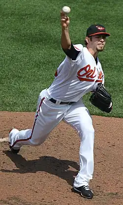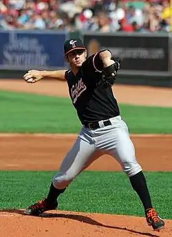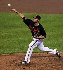 After securing his position in the Orioles' 2011 starting rotation,[30] Arrieta made his season debut for the Orioles' home opener at Camden Yards on April 4. He allowed one earned run on six hits while striking out three in six innings of the Orioles' 5–1 victory over the Detroit Tigers.[31] He began the season as one of Baltimore's best starters, leading the team with nine wins in 18 starts, but there was some concern over his health and command: his ERA was 4.90 in that same time frame, he rarely lasted beyond six innings, and he frequently walked batters. Additionally, by early July, the bone spur in his elbow had begun to bother him again.[32] He walked at least one batter per game until July 20, when he threw a career-high 111 pitches in seven innings against the Boston Red Sox.[33] The fibrous mass in his elbow continued to affect his command, however, to the point where he walked a career-high six batters in a game against the New York Yankees.[34][35] Arrieta underwent a season-ending surgery to remove the mass on August 12, and he finished his sophomore season with a 10–8 record and 5.05 ERA in 22 starts.[36]