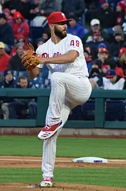 On March 11, 2018, shortly before opening day, the Philadelphia Phillies signed Arrieta to a three-year, $70 million contract with additional options of up to $135 million over five years.[86] The late signing prevented Arrieta from being named to the opening day 25-man roster, as he required additional training time with the Class A-Advanced Clearwater Threshers, but he opened the season shortly afterwards with a start against the Miami Marlins on April 8.[87] Despite a career-low 6.2 strikeouts per nine innings (K/9), down from his 9.3 high in 2015, Arrieta posted an ERA of 0.90 in May 2018 by generating weak contact ground balls for easy outs.[88] This strategy was short-lived: the following month, Arrieta went 0–4 with a 6.66 ERA, telling reporters, "The ball is getting hit. That's it. Making mistakes, too many mistakes, especially against an aggressive, a good lineup."[89] After one game in which the Phillies lost 6–1 to the San Francisco Giants, Arrieta criticized his teammates for their poor defense, especially on infield shifts. He targeted Scott Kingery in particular for not moving quickly enough on the ball that ultimately set up Andrew McCutchen for a three-run home run.[90] Arrieta was also frustrated with himself as the season went on, mostly because he could not explain why his pitching suddenly faltered.[91] He finished the season 10–11 with a 3.96 ERA in 31 starts, with 138 strikeouts in 172+2⁄3 innings.[44]