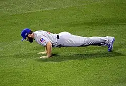 On July 2, 2013, the Orioles traded Arrieta and fellow pitcher Pedro Strop to the Chicago Cubs in exchange for starting pitcher Scott Feldman and catcher Steve Clevenger. The trade was met with criticism from members of the Cubs clubhouse, who were displeased with the decision to trade away Feldman, whose season by that point had been stronger than that of Strop and Arrieta. Arrieta, meanwhile, was assigned to the Triple-A Iowa Cubs in order to reclaim the command that had eluded him in Baltimore.[49] He was first called up to Chicago for a spot start in the second game of a doubleheader against the Milwaukee Brewers, but did not join the Cubs full-time until August 14, when he replaced a struggling Carlos Villanueva in the rotation. Manager Dale Sveum had planned to call up Arrieta for the final stretch of the season in order to find him work with pitching coach Chris Bosio; rather than moving Chris Rusin from the rotation as planned, Villanueva was moved to the bullpen to make room for the new pitcher.[50] He went 4–2 in nine starts for his first season in Chicago, recording a 3.66 ERA and 37 strikeouts in 51+2⁄3 innings.[44] Additionally, in Iowa, Arrieta posted a 2–2 record with a 3.56 ERA and 39 strikeouts in seven starts and 30+1⁄3 innings.[22]