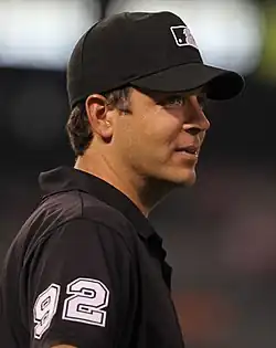 James Patrick Hoye (born February 8, 1971) is an American umpire in Major League Baseball. He wears number 92. Hoye worked as an MLB reserve umpire from 2003 to 2009 for both the American and National Leagues. He was hired to the full-time Major League staff prior to the 2010 season.[1][2] Hoye has worked two All-Star Games (2015, 2024), two World Series (2019, 2022), three League Championship Series (2018, 2020, 2021), five Division Series (2011, 2015, 2019, 2022, 2024), and five Wild Card Games/Series (2014, 2018, 2020, 2021, 2023). He was promoted to crew chief in 2023.[3]