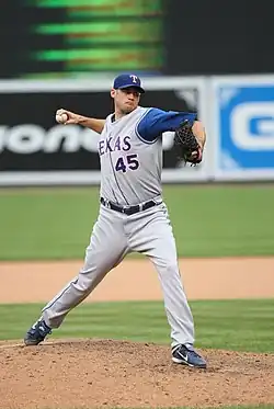 On January 25, 2007, the Texas Rangers signed Wright to a minor-league contract with an invitation to spring training. He competed with Kameron Loe and Bruce Chen for a spot in the starting rotation.[41][42] Winning the fifth spot, Wright made one short start for the Rangers on April 10 before being placed on the 15-day disabled list with right shoulder inflammation.[4][43] After four rehab starts, he was activated on June 15. "My arm strength is good. I'm ready to go and to get back out there," he said.[44] He rejoined the rotation upon being activated on June 15, posting a 3–4 record and a 4.57 ERA through August 3.[43] Long opposed to pitching exclusively in relief, Wright reluctantly moved to the bullpen during the 2007 season, starting just one game for the rest of the season.[2][1][43] The transition would be permanent, as he would start just two more games for the rest of his career.[4] In 20 games (nine starts), he had a 4–5 record and a 3.62 ERA, his finest to that point.[4]