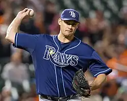 On January 22, 2013, Wright signed a minor league contract with the Tampa Bay Rays.[54] By this time, he was one of three players in the last three decades to play for at least 17 years and never make the playoffs.[2] His contract was selected by the Rays on March 31.[55] On September 1, with the Rays facing a predominantly left-handed Oakland lineup, Rays manager Joe Maddon elected to skip right-handed starter Roberto Hernández's start in favor of a bullpen game handled mostly by left-handers. Wright, making his first start since 2007, allowed one run in 1+2⁄3 innings and left with the game tied, but Oakland won 5–1.[56][57] He finished the season with a 2–2 record in 66 appearances, and his 3.09 ERA was the lowest of his career.[4]
