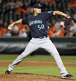 Following the 2010 season, Wright became a free agent, but he resigned with Seattle for 2011.[4] After Wright held opponents scoreless until his 10th game of 2011, Stone wrote that he had "become an increasingly vital member of Seattle's bullpen".[8] On July 5, he earned his first career save, throwing a scoreless 10th inning in a 4–2 victory over Oakland. The save came in his 500th game; only Frank Tanana took more games (530) to get his first save.[4][51] From July 29 to the end of the year, he had a 1.37 ERA in 19 games.[4] In 60 games, he was 2–3 with a 3.16 ERA.[1] He became a free agent after the season.[1]