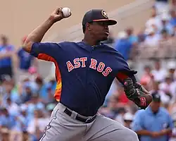 ![]() Gustave pitching for the Houston Astros in 2016 spring training | |