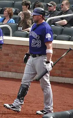 Looking for a veteran bat to help their playoff push, the Colorado Rockies agreed to a deal with Giambi on August 23, 2009.[28] He was assigned to their AAA affiliate, the Colorado Springs Sky Sox.[29] Giambi chose to wear the number 23 for his jersey number. His first RBI with the Rockies came in the form of a bases loaded walk in his first plate appearance on September 1, 2009, after being promoted to the club upon roster expansion earlier that day.[30] That year, he had many clutch hits which kept the Rockies in contention for the National League Wild Card. He quickly became a fan favorite in Colorado.