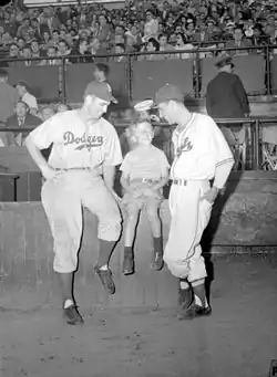 A young fan between Hugh Casey (left) and Jean-Pierre Roy (right) in Delorimier Stadium, Montreal, 6 July 1946.