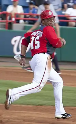On January 19, 2011, Hairston agreed to a one-year, $2 million contract with the Washington Nationals that included over $1 million in incentives.[58] He became the team's starting third baseman after Ryan Zimmerman missed significant time to an abdominal injury.[59][60] He missed most of July with a broken wrist after being hit by Angels pitcher Dan Haren.[61] On July 20, his first game back from the disabled list, Hairston had three hits, including a two-run home run off J.A. Happ.[62] He played in 75 games for the Nationals, hitting .268 with four home runs and 24 RBI.
