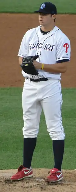 In his first season, he amassed a 3–1 win–loss record, 4.32 ERA, 41 strikeouts, and 9 walks in 33+1⁄3 innings pitched for the Gulf Coast League Phillies.[5] He also pitched in three games for the Williamsport Crosscutters that year. In 2011, Biddle pitched for the Lakewood BlueClaws where he was 7–8 with a 2.98 ERA in 25 games (24 starts).[6] That same year, Baseball America named Biddle the #2 prospect in the Phillies organization, and in 2012 Baseball America named Biddle the #1 prospect in the Phillies organization.[7] He spent 2012 with the Clearwater Threshers where he posted a 10–6 record and 3.22 ERA in 26 starts.