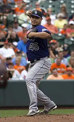 Chacín signed with the Colorado Rockies as an international free agent in 2004[2] and was considered to be one of their top prospects prior to 2009 and 2010.[3] He was called up directly to the majors from the Double-A Tulsa Drillers on July 24, 2009. In 2010, in his first full season in MLB with the Rockies, Chacín had 9 wins, a 3.28 ERA, and led all National League rookies with 138 strikeouts.[4]