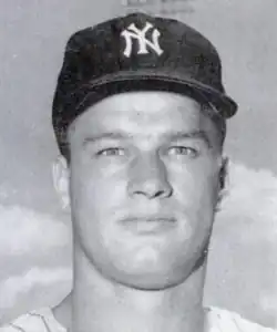 Bouton appeared in 36 games (16 starts) during the 1962 season, going 7–7 with two saves and a 3.99 ERA.[5] He did not play in the Yankees' 1962 World Series victory over the San Francisco Giants, although he had originally been slated to start Game 7. When the game was postponed a day because of rain, Ralph Terry pitched instead. Bouton went 21–7 and 18–13 in the next two seasons, and appeared in the 1963 All-Star Game.[5] In Game 3 of the 1963 World Series, Don Drysdale of the Los Angeles Dodgers pitched a three-hit shutout in a 1–0 victory, while Bouton gave up just four hits in seven innings for the Yankees. The only run scored in the first inning on a walk, wild pitch and single by Tommy Davis that bounced off the pitching mound.[6]
