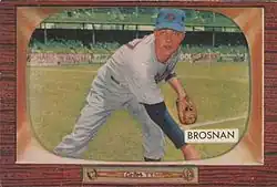 James Patrick Brosnan (October 24, 1929 – June 28, 2014) was an American baseball player and author who played in Major League Baseball in 1954 and from 1956 through 1963. A right-handed pitcher, he appeared in 385 games, largely in relief, for the Chicago Cubs, St. Louis Cardinals, Cincinnati Reds and Chicago White Sox.[1] Brosnan was listed as 6 feet 4 inches (1.93 m) tall and 197 pounds (89 kg).[2]