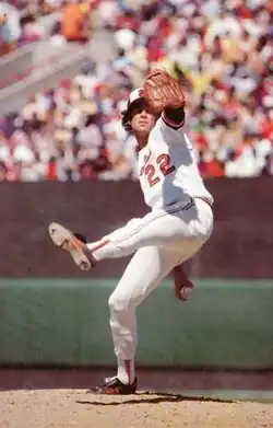 After making $185,000 in 1976, Palmer hoped for a raise in 1977. The Orioles offered $200,000 initially but Palmer wanted $275,000. They finally agreed on a $260,000 salary, with a bonus for a "significant contribution."[34] In 1977 and 1978, Palmer won 20 and 21 games, respectively. Despite the 20 wins in 1977, the Orioles almost refused to give him a bonus. After the Major League Baseball Players Association filed a grievance in Palmer's dispute and threatened to go to arbitration (which likely would have resulted in Palmer becoming a free agent), GM Hank Peters relented and gave him the bonus.[35] During the period spanning 1970 to 1978, Palmer had won 20 games in every season except for 1974. During those eight 20-win seasons, he pitched between 274+1⁄3 and 319 innings per year, leading the league in innings pitched four times and earned run average twice. During that span, he threw between 17 and 25 complete games each year.[36] Frustrated that pitchers who had become free agents like Vida Blue and Bert Blyleven were making more money than he in 1979, Palmer told a reporter for the St. Paul Pioneer Press "I'm going to aggravate [the Orioles] until they trade me."[37] Manager Earl Weaver responded by pinning a note to his locker that said, "Happy Father's Day. Now grow up."[38] "He's right he's underpaid...He's worth a million dollars when he's pitching but he signed for $260,000."[38] Palmer eventually got over being discontent and the team won the AL pennant.[39] Weaver tabbed Palmer to start Game 1 of the ALCS against the Angels, although Palmer asked him to start Mike Flanagan, the 1979 Cy Young Award winner, instead, Weaver valued Palmer's experience. Matched up against Ryan, Palmer allowed three runs in nine innings, taking a no-decision as he left with the game tied. The Orioles won in the 10th on a John Lowenstein home run and won the series 3–1.[40]
