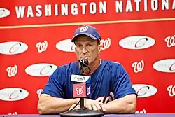 Riggleman was named bench coach for the Washington Nationals for the 2009 season, and was promoted to interim manager on July 12, 2009, following Manny Acta's midseason dismissal.[9] Riggleman picked McLaren as his bench coach. Riggleman hired Burton Rocks as his agent to negotiate his managerial deal with the Washington Nationals in November 2009.[10][11] The Nationals retained Riggleman as manager for the 2010 and 2011 seasons, but on June 23, 2011, he resigned as manager of the Nationals after a win against the Seattle Mariners and after the team won 11 of its previous 12 games. Riggleman was unhappy the team had yet to pick up his contract option for the 2012 season. He said he told team management before the game he "wanted to have a conversation" about his contract before the team left for a series against the Chicago White Sox, but "they didn't want to do that", so he offered his resignation. "I'm 58, I'm too old to be disrespected", he said.[12][13] He finished with a record of 140 wins and 172 losses.[7]