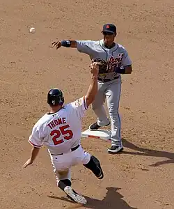 Since Thome was a pull hitter, opposing teams often employed a defensive shift against him, by playing three infielders on the right side of the field and the outfielders towards his pull side, which put teams in a better position to field batted balls.[123][124] In 2011, Lindy's Sports described him as an "extremely patient veteran slugger who launches cripple fastballs and breaking-ball mistakes to all fields", though they did note that he struck out frequently, had poor speed, and should serve only as a designated hitter.[125] During his career, he had strong power numbers; in 15 of his 22 seasons, he had a slugging percentage over .500.[18] He is an example of a "three-true-outcome" player; 47.6% of his career plate appearances resulted in either home runs, strikeouts, or walks, the highest of all time by nearly seven percentage points.[126] Thome averaged 111 walks per 162 games, and currently ranks seventh on the MLB career walks list with 1,747. He led the American League in walks in three seasons, all with Cleveland (1997, 1999 and 2002). He is a self-described slow runner, but has said that he always hustled.[126] He stole only 19 bases after 1994.[127]