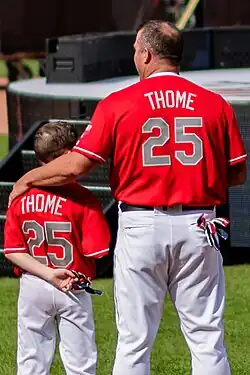 Thome and his wife, Andrea, have two children, Lila Grace and Landon.[151] He has also established funds to put his 10 nieces and nephews through college.[152] During the offseason he lives in Burr Ridge, Illinois.[6] ESPN's SportsCenter reported that shortly after his nephew, Brandon, was paralyzed in an accident, he asked Thome to hit a home run for him; Thome obliged, hitting two in the subsequent game.[153] Thome is also a philanthropist and provided help to the communities surrounding the teams for which he played. In recognition of his community involvement, he was given the Marvin Miller Man of the Year Award in 2001 and 2004, and the Lou Gehrig Memorial Award in 2004.[154] In 2013, after the November 17, 2013, tornado outbreak struck Washington, Illinois, just 15 miles (24 km) from his hometown, he and his wife pledged to donate $100,000 to relief efforts.[155] Among the philanthropic endeavors Thome and his wife heavily support are Children's Home + Aid, which strives to help underprivileged children predominantly with finding care (e.g., foster care, adoption, etc.),[156] and an annual benefit to raise money for the Children's Hospital of Illinois, continuing a tradition his mother started years ago.[157] Moreover, the Thomes try "to stay connected with at least one or two organizations in each of the cities" that Thome has played.[156]