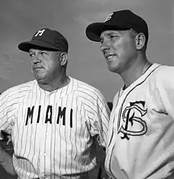 Foxx worked as a minor league manager and coach after his playing days ended, including managing the Fort Wayne Daisies of the All-American Girls Professional Baseball League for one season in 1952.[42] He took the team to the playoffs where they lost in the first round 2 games to 1 against the Rockford Peaches. The character of Jimmy Dugan in the 1992 movie A League of Their Own, played broadly by Tom Hanks, is loosely based on Foxx, though his players remember Foxx as having behaved significantly more gentlemanly to them, rather than the brusque manner Hanks showed his team. Foxx served as head coach for the University of Miami baseball team for two seasons, going 9–8 in 1956 and 11–12 in 1957, before being let go following the 1957 season.[4]