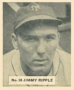 James Albert Ripple (October 14, 1909 – July 16, 1959) was an American professional baseball player who played as an outfielder in Major League Baseball for seven seasons, from 1936 to 1943. Ripple appeared for the New York Giants (1936–1939), Brooklyn Dodgers (1939–1940), Cincinnati Reds (1940–1941) and Philadelphia Athletics (1943). He had a .282 career batting average, with 28 home runs and 251 RBIs in 554 games played. He played in three World Series, two with the Giants (1936–1937), and one with the Reds in 1940, the last of which won the championship.