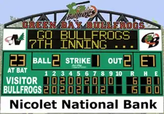 In a press conference on April 2, 2008, the Green Bay Bullfrogs announced renovation plans for the 2008 season. The first phase, done in partnership with Nicolet Bank of Green Bay, included a professional style scoreboard in right center field that is 28 feet (8.5 m) high at its peak and measures 28 feet (8.5 m) wide. It also features a large 20'L x 3'4"H graphics/messaging display and a back lit custom designed truss displays the team name and logo. The second phase of this project involved the installation of a Speed Pitch Radar Display in left center field to visually complement the new scoreboard and allow fans to keep track of how fast a pitcher is throwing the ball.[2][3]