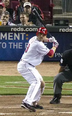 On September 11, Votto hit his first career walk-off home run off Pirates relief pitcher Justin Thomas.[40] For the season, Votto hit .324 with 113 RBI, 106 runs scored and 37 home runs, including a grand slam off Tommy Hanson of the Atlanta Braves on May 20. He finished the season leading the major leagues in on-base percentage (.424) and led the National League in slugging percentage (.600) and on-base plus slugging (1.024). The Reds made the playoffs but lost to the Philadelphia Phillies in the National League Division Series in a three-game sweep.[41] Votto struggled in the series, batting .100 with one run batted in.[22]