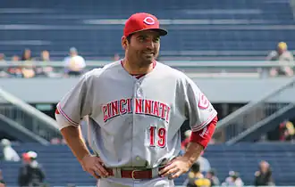 Joseph Daniel Votto (born September 10, 1983) is a Canadian-American former professional baseball first baseman who spent his entire 17-year Major League Baseball (MLB) career with the Cincinnati Reds from 2007 to 2023. He was the second Canadian player, following Larry Walker, to have 2,000 hits, 300 home runs, and 1,000 runs batted in (RBI) in MLB.[1] Votto is a six-time MLB All-Star, a seven-time Tip O'Neill Award winner, and two-time Lou Marsh Trophy winner as Canada's athlete of the year.[2] In 2010, he won the National League (NL) Most Valuable Player Award and Hank Aaron Award. Renowned for his plate discipline and ability to get on base, Votto was first in career walks (1,365), third in on-base percentage (.409), and fourth in on-base plus slugging (.920) among all active players at the time of his retirement during the 2024 season. He is one of two Reds with at least 300 home runs, 1,000 RBI, and 2,000 hits in franchise history, the other being Johnny Bench.