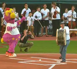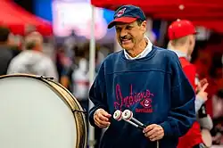 Adams was recognized by the Cleveland Guardians and other organizations for his long commitment to the team. On October 4, 2007, he threw out the ceremonial first pitch for the Indians' first game in the 2007 American League Division Series, against the New York Yankees.[12] After Adams drummed at his 3,000th game on April 27, 2011, the Indians celebrated it the following Saturday, on April 30, 2011, by incorporating Adams in the ceremonial first pitch and putting on a pregame parade featuring Adams's fellow Indians fans carrying bongos, snares, and plastic toy drums.[5][13] For the ceremonial first pitch, Adams swung at the ball with his drum from home plate after it was thrown by former Indians player Joe Charboneau.[5] On August 24, 2022, the 49th anniversary of when he started drumming at Cleveland baseball games, the team—now renamed the Guardians—announced that Adams had been inducted into the Cleveland Guardians Distinguished Hall of Fame, and that a bronze replica of his drum, attached to his seat, would be on display in their stadium.[14]