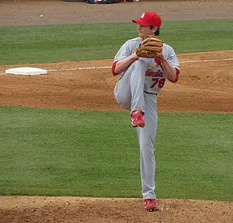 Gast began the 2013 season with Memphis, where he pitched 32 consecutive scoreless innings.[6] He was named Pacific Coast League pitcher of the week for the week ending April 21.[7][8] Gast was called up on May 12, 2013, after Jake Westbrook was put on the 15-day disabled list.[9] Gast made his major league debut on May 14, 2013 at Busch Stadium against the New York Mets. Gast threw five shutout innings but gave up four runs in the sixth inning. He gave up six hits total, walked one, and struck out three to earn his first victory as a Cardinal.[6] Gast won in his second start with the Cardinals as well, giving up two runs on four hits and two walks over 5 innings as St. Louis beat the Milwaukee Brewers 4-2.[10] He was placed on the disabled list on May 26, after suffering a shoulder strain.[11] On July 26, Gast underwent season-ending surgery on his left shoulder. According to general manager John Mozeliak, the expected recovery and rehabilitation timeline was 8-12 months.[12] The procedure was the second major surgery for Gast, his first being Tommy John surgery while he was a high school senior.