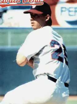 John Raymond Hudek (born August 8, 1966) is an American former Major League Baseball pitcher. He played all or part of six seasons in the majors, from 1994 until 1999, for five different teams. He appeared in a total of 194 major league games, all in relief, making the 1994 NL All-Star team as a rookie. Once, in a game on September 5, 1997, he was tasked to pitch against Brian Johnson with runners on. With two strikes, catcher Tony Pena seemed to call for an intentional walk before Hudek threw a pitch in the middle of the zone for a strike that struck-out Johnson.[1]