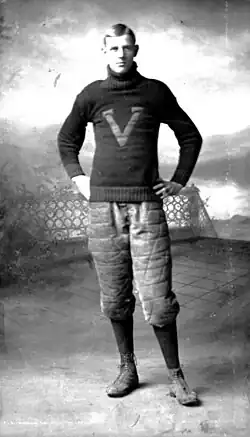 He was admitted to Vanderbilt University in Nashville, where he was a member of the Phi Delta Theta fraternity (Tennessee Alpha Chapter) and a standout athlete in baseball, basketball, football and track.[3] His time at Vanderbilt overlaps with Grantland Rice. As a senior, Tigert was honored as an All-Southern halfback for the Vanderbilt Commodores football team.[4][5] In his final game, he scored the first points netted all season against rival Sewanee.[6]