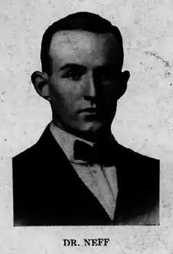 While attending the University of Virginia, Neff captained the 1907 football team.[2] After obtaining his M.D. in 1910, Neff worked at the University of Virginia Hospital first as an intern and surgeon and then later as professor of urology.[3] He was also a member of the Southern Surgical Association, for which he served as vice president from 1934 until his death in 1938.[4]