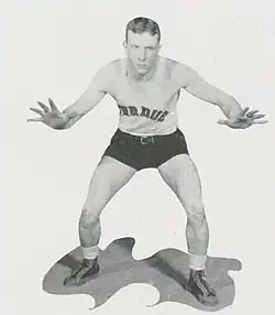 After graduating from high school in 1928, he attended Purdue University and was coached by Ward "Piggy" Lambert. The 1932 Purdue team on which he played as a senior was retroactively recognized as the pre-NCAA tournament national champion by the Helms Athletic Foundation and the Premo-Poretta Power Poll.[14] John Wooden was named All-Big Ten and All-Midwestern (1930–32) while at Purdue, and he was the first player ever to be named a three-time consensus All-American.[15] In 1932, he was awarded the Big Ten Medal of Honor, recognizing one student athlete from the graduating class of each Big Ten member school, for demonstrating joint athletic and academic excellence throughout their college career.[16] He was also selected for membership in the Beta Theta Pi fraternity.[17] Wooden is also an honorary member of Alpha Phi Omega National Service Fraternity.[18] Wooden was nicknamed "The Indiana Rubber Man" for his suicidal dives on the hardcourt.[15] He graduated from Purdue in 1932 with a degree in English.[4]