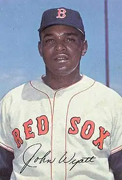 John Thomas Wyatt (April 19, 1934 – April 6, 1998)[1] was an American professional baseball pitcher. He played all or part of nine seasons in Major League Baseball (MLB), primarily as a relief pitcher. From 1961 through 1969, he played for the Kansas City Athletics (1961–66), Boston Red Sox (1966–68), New York Yankees (1968), Detroit Tigers (1968) and Oakland Athletics (1969). In the Negro leagues, he played for the Indianapolis Clowns (1953–55).[2] Wyatt batted and threw right-handed.