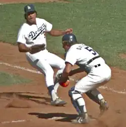 With the Dodgers, Oates worked as a second-string catcher behind Steve Yeager and would once again reach the post-season as the Dodgers clinched the 1977 National League West title.[13] The Dodgers went on to defeat the Philadelphia Phillies in the 1977 National League Championship Series before eventually losing to the New York Yankees in the 1977 World Series.[13] In 1978, Oates appeared in only 40 games as the Dodgers repeated as Western Division champions and, once again defeated the Philadelphia Phillies in the 1978 National League Championship Series.[1][14] The 1978 World Series was also a repeat of the previous year, as the Dodgers once again lost to the Yankees in a six-game series.[14] Oates' playing time decreased further in 1979, as he appeared in only 26 games before being released at the end of the season.[1] He became a free agent and signed a contract to play for the New York Yankees on April 4, 1980.[12] Oates served as a backup to Rick Cerone during the 1980 season before playing in his final game on May 24, 1981, at the age of 35.[1]