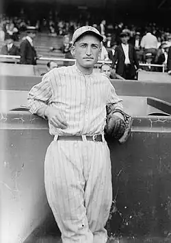 Rawlings returned to major league action with the Boston Braves (1917-20), and later played for the Philadelphia Phillies (1920-'21), New York Giants (1921-'22) and Pittsburgh Pirates (1923-26). His most productive season came in 1921 for Phillies and Giants, when he posted career highs in hits (156), runs (60), extrabases (27), RBI (46) and games played (146), while hitting .278 average. In 1922, Rawlings hit .282 in 82 games, good enough to play for John McGraw's National League pennant winning Giants in 1921 and 1922. He hit .333 (10-for-30) with three doubles and four RBI for the 1921 Giants World Series champions. Of particular note was the last play in the series, the last time a best-of-nine game format was used. With the Giants winning in the ninth inning and the Yankees facing elimination, Yankees manager Miller Huggins sent Babe Ruth in to pinch hit to lead off the inning. Ruth had knee and elbow injuries and had missed Games 6 and 7 completely, and had sat out Game 8 thus far. He grounded out to the first baseman unassisted. Aaron Ward coaxed a walk, and represented the tying run. The next batter was Home Run Baker. After fouling off several pitches, he hit a ball that appeared to have eyes for right field. Ward took off on contact. Rawlings reached the ball, and after tumbling, threw to first base from his knees to get the out. Ward inexplicably continued running, rounded second base, and with his head down, barreled toward third. An astute throw to Frank Frisch at third base nailed Ward for the third out, and the Series was won by the Giants. Six seasons later, the winning pitcher, Art Nehf, then with the Cincinnati Reds, would call Rawlings' snag the best play he had ever seen.[1] In all, Rawlings earned three World Series rings, though he did not play for the 1922 Giants and 1925 Pirates series champions. During an early September game at Pittsburgh against the St. Louis Cardinals, Rawlings, now playing for the eventual World Champion Pirates, broke the fibula near the ankle in his left leg, while sliding into second base. The injury would keep him out of the World Series, and would cut short his major league playing career the following year.