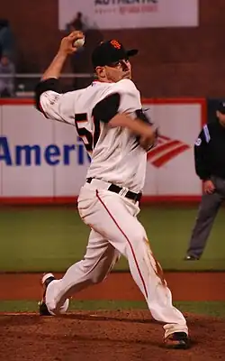 Sánchez was arbitration eligible to begin 2010, but he avoided arbitration by signing a one-year contract with the Giants.[38] He was named the fourth starter out of spring training this time. Sánchez began started strong in 2010, as he was 7–6 by the All-Star break. Because of injuries to the Giants' left-handed relief pitchers, Sánchez made his only relief appearance of the year on July 30 in a 6–5 win over the Los Angeles Dodgers.[39] On August 3, Sánchez tied Juan Marichal's record when he struck out seven straight batters in a 10–0 win over the Colorado Rockies.[40] Two months later, on the last day of the season, Sánchez started against the San Diego Padres. Sánchez pitched five shutout innings, scored the first run after hitting a triple in the third inning, and was the winning pitcher in a 3–0 win. The win sent the Giants to the playoffs for the first time since 2003.[41]