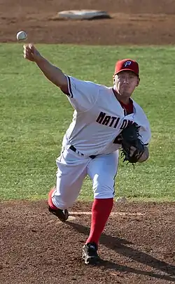 In 2010, he made quick progress. Over four minor league levels, he started 10 games in limited play, racking up just 39+2⁄3 innings, but compiling a solid record: 1.59 ERA, 27 hits allowed, 31 strikeouts, and just six walks.[9] On August 26, he was recalled to make his 2010 debut back in the big leagues, where Zimmermann got a no-decision in an eventual win by the Nationals over the Cardinals. On this same day, the Nationals learned that their other young pitching phenom, Stephen Strasburg, would need Tommy John surgery and would be out for 12–18 months. In Zimmermann's second return start, however, five days later, he pitched six shutout innings, allowing only one hit, no walks, and striking out nine, a personal best. He also became the first National to get through six innings facing only 18 batters.[10] Zimmermann finished the 2010 year 1–2 with a 4.94 ERA in seven starts.