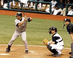 In 2004, Posada grounded into 24 double plays, which tied for the most in the AL, but batted .272 with 21 home runs and 81 RBIs.[42] After defeating the Minnesota Twins in the 2004 ALDS,[43] the Yankees lost to the Boston Red Sox in the 2004 ALCS despite leading the series three games to none.[44] In 2005, Posada batted .262 with 19 home runs and 71 RBIs. The Yankees reached the postseason again, but lost to the Los Angeles Angels of Anaheim in the 2005 ALDS.[45]