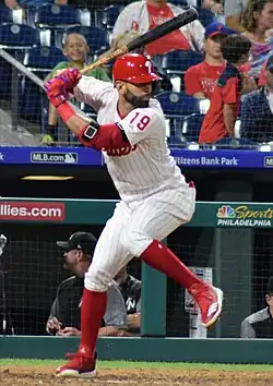 On August 28, 2018, the Mets traded Bautista to the Philadelphia Phillies for a player to be named later or cash.[131] He batted .244 with two home runs and 6 RBI in 27 games with the Phillies, and posted a .404 OBP and .870 OPS.[16] He was the 9th-oldest player in the National League.[132] Bautista elected free agency on October 29.