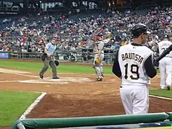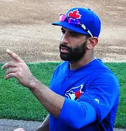 Bautista was traded to the Blue Jays in August 2008.[3] After making adjustments to his swing, he broke through with ten home runs in September 2009. From 2010 to 2017, Bautista hit at least 20 home runs each year, and in four of those seasons, hit at least 35 home runs, both scored and drove in at least 100 runs, and drew at least 100 bases on balls, including twice leading the AL. In 2015, while playing in the playoffs for the first time, his bat flip in the American League Division Series (ALDS) caused a sensation that became a symbol of Toronto's first playoff appearance in 22 years. He is a leader or among the top ten in numerous offensive single-season and career categories for the Blue Jays.[4]