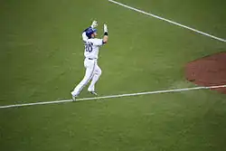 Despite struggling with a hip injury late in the season,[49] Donaldson played very well in the Jays' division series with the Texas Rangers, the second consecutive season Toronto faced Texas in the playoffs. In the three game sweep, he hit for a .500 batting average, five doubles, .526 on-base percentage, .778 slugging percentage, four runs scored and three RBI.[50] He also scored the series-winning run in the tenth inning in dramatic fashion, scampering home from second base on a heads-up base running play following a throwing error by Rangers' second baseman Rougned Odor.[51] Donaldson was awarded his second consecutive Silver Slugger Award on November 10.[52] He finished fourth in American League MVP voting.[53]