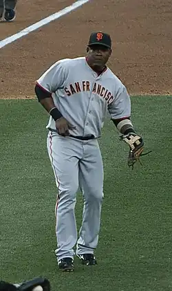 On January 29, 2009, Uribe signed a minor league deal with the San Francisco Giants.[34] It was announced on April 4 that Uribe had made the Giants final roster as a utility player.[35] Uribe wound up making a lot of starts at second base, shortstop, and third base throughout the season.[36] On July 10, Uribe bobbled a ground ball with one out in the eighth inning of Jonathan Sánchez's no-hitter against San Diego, allowing Chase Headley to reach first base. The effort had been perfect up to that point, and Sánchez went on to retire each of the remaining five batters, meaning this error lost the first perfect game since Randy Johnson 's in 2004. This was the first no-hit, no-walk, no–hit batsman game that was not also a perfect game since Terry Mulholland's no-hitter in 1990.[37] In 122 games (398 at-bats), Uribe batted .289 (his highest average since 2001) with 115 hits, 26 doubles, 16 home runs, and 55 RBI.[1]