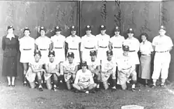 Back, L-R: Barbara Liebrich (chaperone), Nancy Warren (P), Carol Habben (OF/C), Mary Taylor (OF), Dorothy Schroeder (SS), Kay Blumetta (P/1B), Gloria Cordes (P), Chris Ballingall (C), Jean Marlowe (P/OF), Jane Stoll (OF), Mitch Skupien (manager). Middle, L-R: Jenny Romatowski (C/3B), June Peppas (P/1B), Elaine Roth (P/OF), Nancy Mudge (2B), Fern Shollenberger (3B), Jean Lovell (C/P). Front: Judy [?] (bat girl).