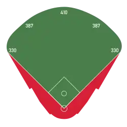 | Field size | Left Field – 330 ft (101 m) Left-Center – 385 ft (117 m) (1973-1994) 375 ft (114 m) (1995-2003) 385 ft (117 m) (2004-2008) 387 ft (118 m) (2009-present) Center Field – 410 ft (125 m) (1973-1994) 400 ft (122 m) (1995-2003) 410 ft (125 m) (2004-present) Right-Center – 385 ft (117 m) (1973-1994) 375 ft (114 m) (1995-2003) 385 ft (117 m) (2004-2008) 387 ft (118 m) (2009-present) Right Field – 330 ft (101 m) Backstop – 60 ft (18 m) (1973-present) ![]() |