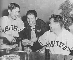 Inao (center) with teammate Yasumitsu Toyoda(left) and manager Osamu Mihara during the 1956 Japan Series | |
