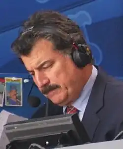 Hernandez, alongside Gary Cohen and Ron Darling, is now a baseball commentator serving as an analyst for Mets' television broadcasts on SNY and WPIX (WPIX games are produced by SNY). He's become known for wry humor and ironic commentary, as well as blunt outspokenness, on the mic. A television advertisement for SNY Sports referred to Hernandez's mustache by imagining a celebration known as "Keith Hernandez Day" at which all attendees are required to wear authentic Keith Hernandez mustaches. One sports fan, who refuses to respect the day by wearing a mustache, is met by the steely, disapproving stare of Hernandez himself. Hernandez admitted that he never wore eyeblack while playing because he had high cheekbones.[27] In 2007 Hernandez won the "Mustache Madness" contest on newsday.com, and the American Mustache Institute chose his facial hair as the "top sports mustache ever".[26] Baseball-Reference.com ranks Hernandez's mustache as the fourth-best in history.[28]