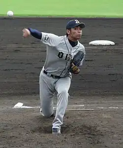 With three quarters delivery, he throws a four-seam fastball up to a speed of 152 km/h (94 mph)[12] and a 150 km/h (93 mph) cutter that sharply changes course just as it approaches the batter.[13] Also included in his arsenal is a 130 km/h (81 mph) slider that follows a large hooking motion.
