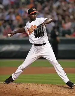 With the Giants, Hawkins assumed an eighth inning setup role, frequently preceding closer Tyler Walker.[36][38] When Hawkins returned to Wrigley Field in late July, he was booed again by the Cubs fans.[39] He suffered another blown save during the series on July 26, but the Giants won the game 3–2.[40] In 45 games with the Giants, Hawkins had a 1–4 record and a 4.10 ERA.[10] Between the Cubs and Giants, Hawkins's record was 2–8 in 66 games, with an ERA of 3.83. He allowed 58 hits in 56+1⁄3 innings pitched and posted a 1.46 WHIP.[10] On December 6, Hawkins was traded along with cash considerations to the Baltimore Orioles for left-handed reliever Steve Kline.[10][41]