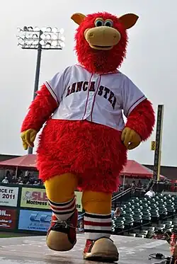 The Lancaster Stormers' mascot is an anthropomorphic, red cow named Cylo. He wears the team's home jersey with striped socks and retro-style sneakers. Cylo debuted on March 4, 2005, at the Mascot Roller Mill in the Lancaster County village of Mascot. His name in full is Cyloicious L. Barnstormer, alluding to Hall of Fame pitcher Cy Young and to silos, representing the county's agricultural heritage.[36] The mascot was designed by the Raymond Entertainment Group,[36] which also produces the Phillie Phanatic's costume.