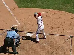 However, the decision to not bat against Johnson instigated a debacle as one of the indelible moments of Walker's career one month later in the All-Star Game. This time, Walker faced Johnson, who theatrically threw over his head. Ever adaptable, Walker placed his batting helmet backwards and switched sides in the batters' box to stand right-handed for one pitch. He ended the at bat by drawing a walk.[50] The incident momentarily drew mirth and laughter from players in both dugouts, fans and announcers, and comparisons to Johnson pitching against John Kruk in the 1993 All-Star Game, in which he also threw over his head.[51] In spite of garnering a reputation of avoiding Johnson,[52] Walker batted .393 (11 hits in 28 at bats) against him in his career,[53] nearly double the rate of all left-handed batters at .199.[54]